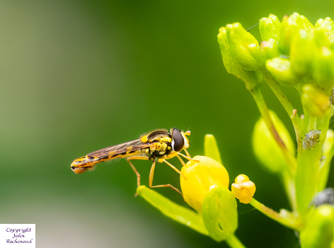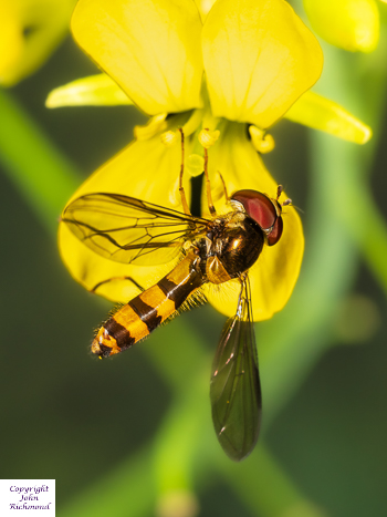 Male hoverfly, Sphaerophoria scripta, feeding on a flower of mustard