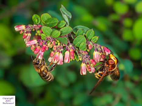 Honey bee and Hornet mimic hoverfly feeding on snowberry